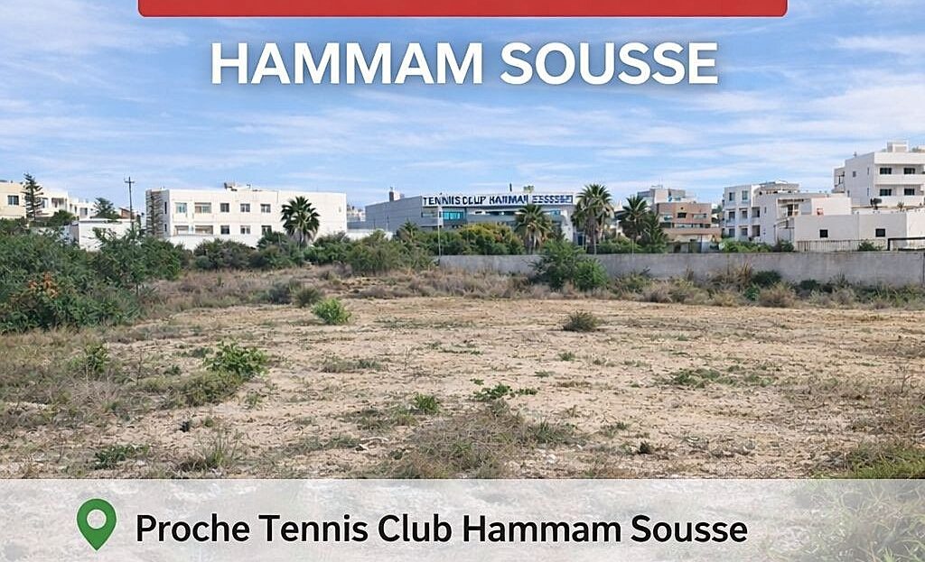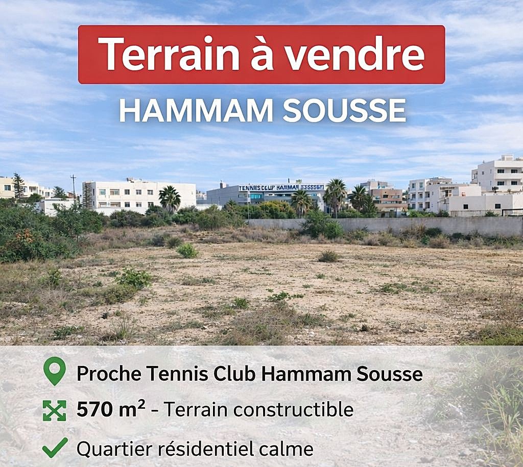 À vendre, un terrain constructible de 570 m², idéalement situé à Hammam Sousse, à quelques pas du Tennis Club, dans un quartier résidentiel calme et en plein développement.